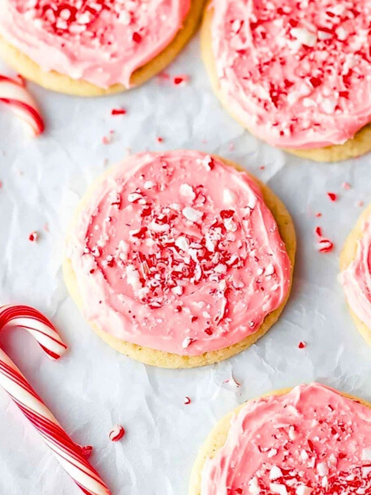 Let cookies cool completely on a wire rack. Once cooled, spread the peppermint frosting generously on each cookie and sprinkle with crushed candy canes.