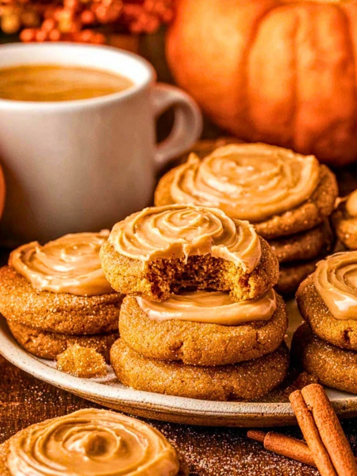 These cookies are ideal when you want something seasonal but still easy enough for a casual baking day. They have that bakery-style look with a cinnamon-sugar finish and a swirl of frosting on top, yet the flavor stays familiar and comforting. They fit right in at autumn gatherings, weekend baking sessions, holiday dessert tables, or a quiet afternoon with a hot drink.
