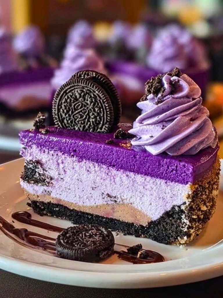 A no-bake layered dessert featuring an Oreo cookie crust, velvety ube-flavored cream cheese center, and a smooth purple glaze. Topped with whipped swirls and whole Oreos, it’s an eye-catching treat for any occasion—elegant, creamy, and surprisingly easy to make.