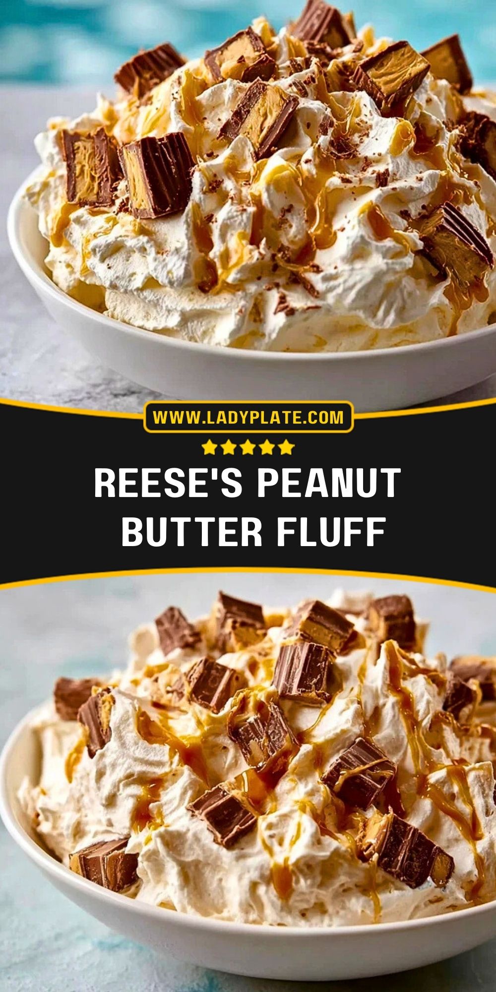 Transfer the fluff to a wide serving bowl. Top with remaining chopped Reese’s for presentation. Chill for at least 1 hour before serving to let the flavors meld.