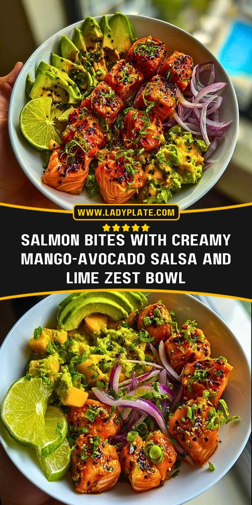 This vibrant salmon bowl is a feast of colors and flavors — featuring perfectly seared salmon bites glazed with garlic, lime zest, and black sesame seeds. The cool mango-avocado salsa brings a creamy-tropical contrast, layered with crisp red onions and herbaceous freshness. Ideal for a quick lunch or an elegant dinner, this bowl is equal parts healthy and indulgent.
