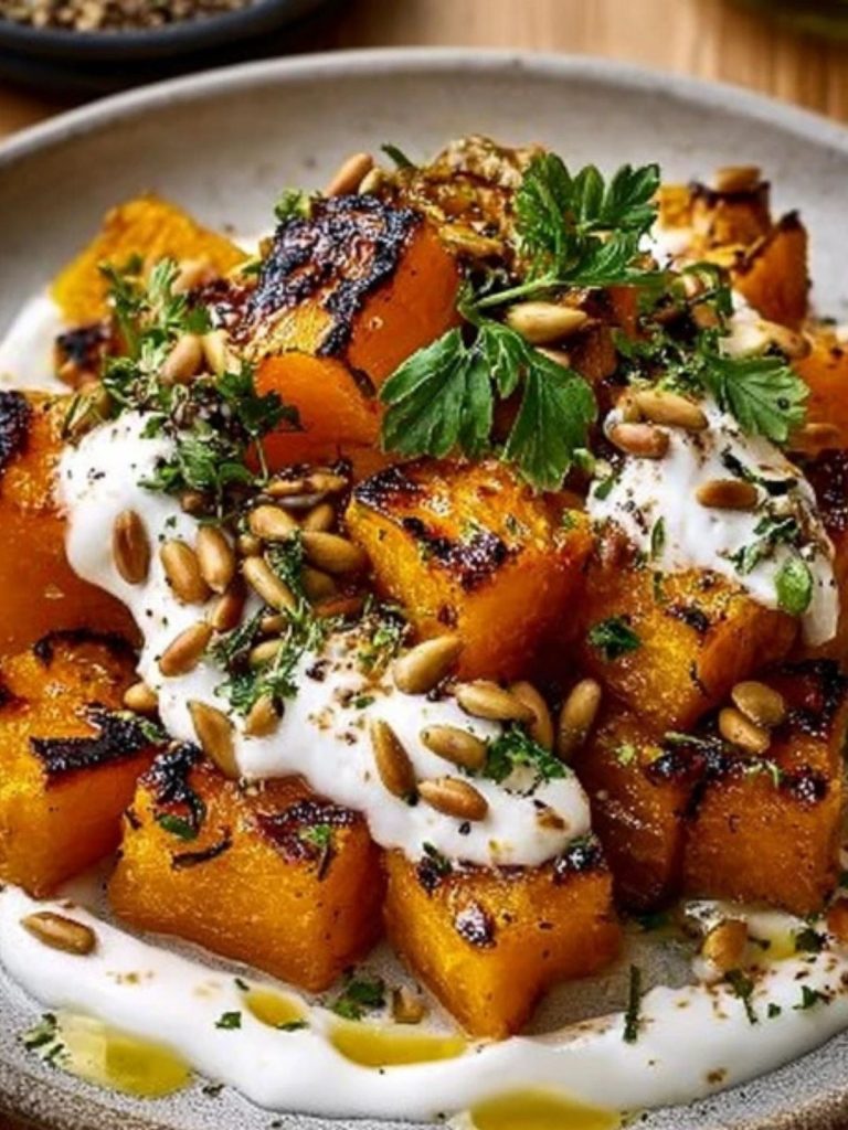 Craving something cozy yet vibrant for your next fall or winter dinner? Imagine fork-tender roasted pumpkin cubes kissed with smoky char, drizzled with a creamy lemon yogurt, and finished with golden, toasted pine nuts. This is the kind of side dish that steals the show—beautiful, earthy, and surprisingly easy to prepare.