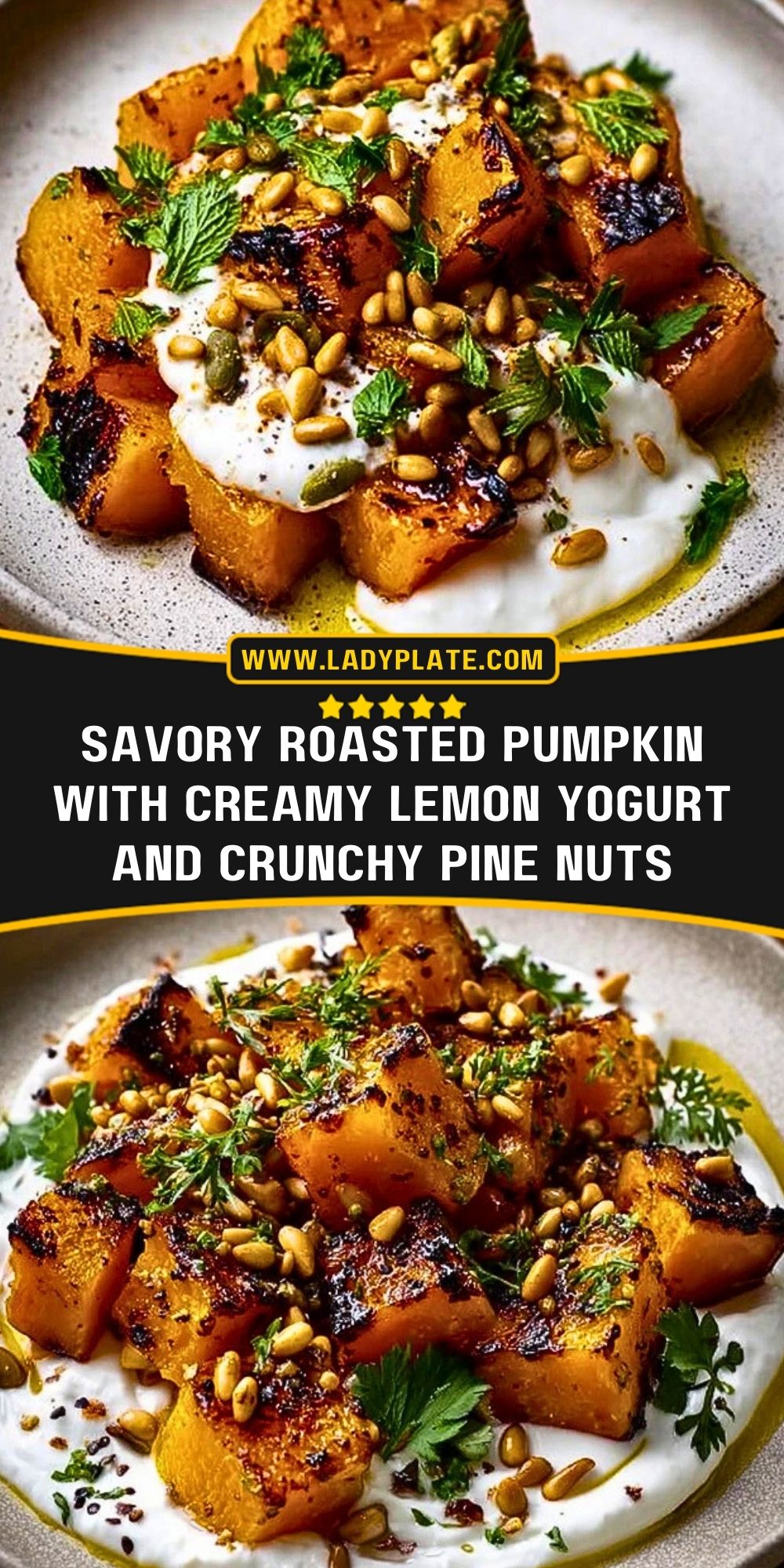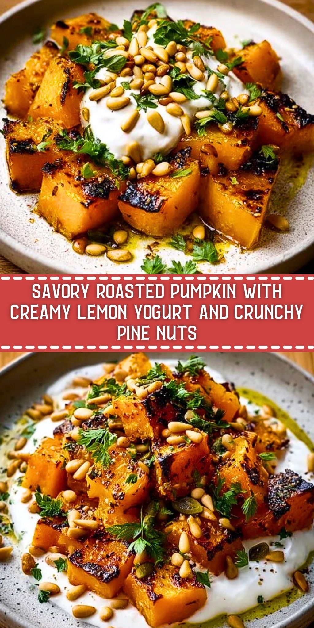 Savory Roasted Pumpkin with Creamy Lemon Yogurt and Crunchy Pine Nuts