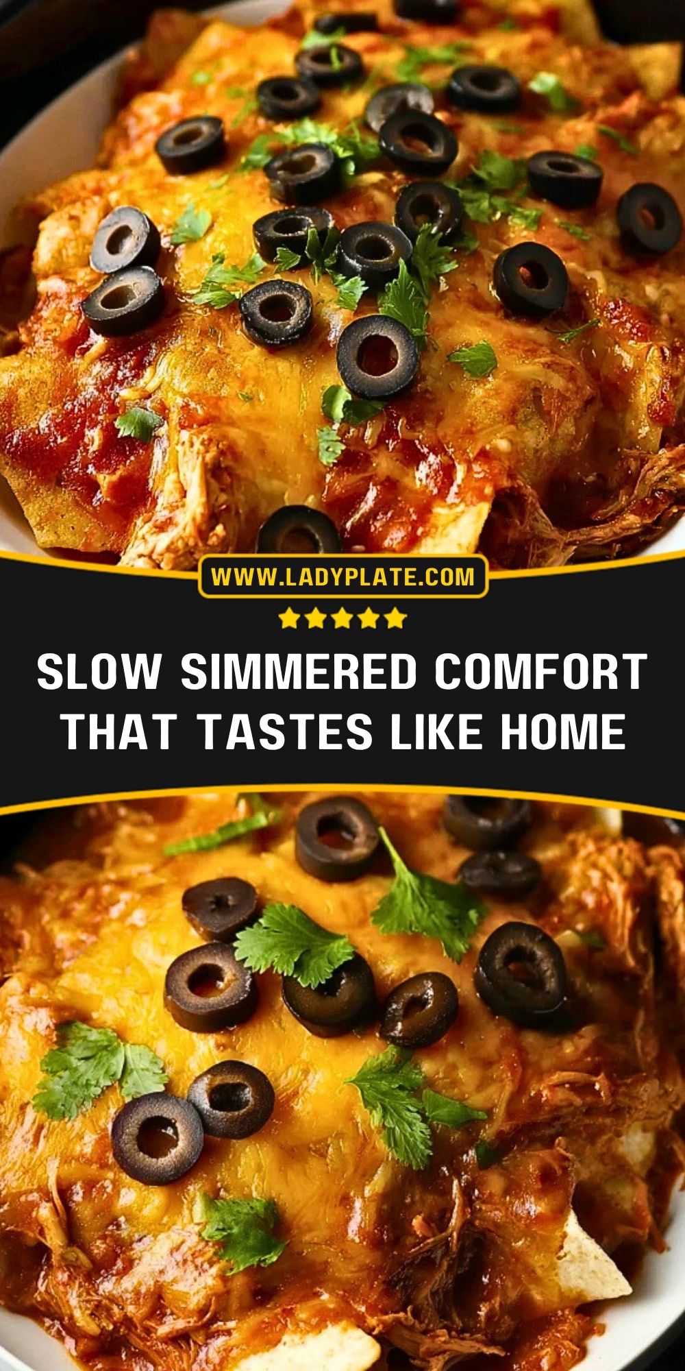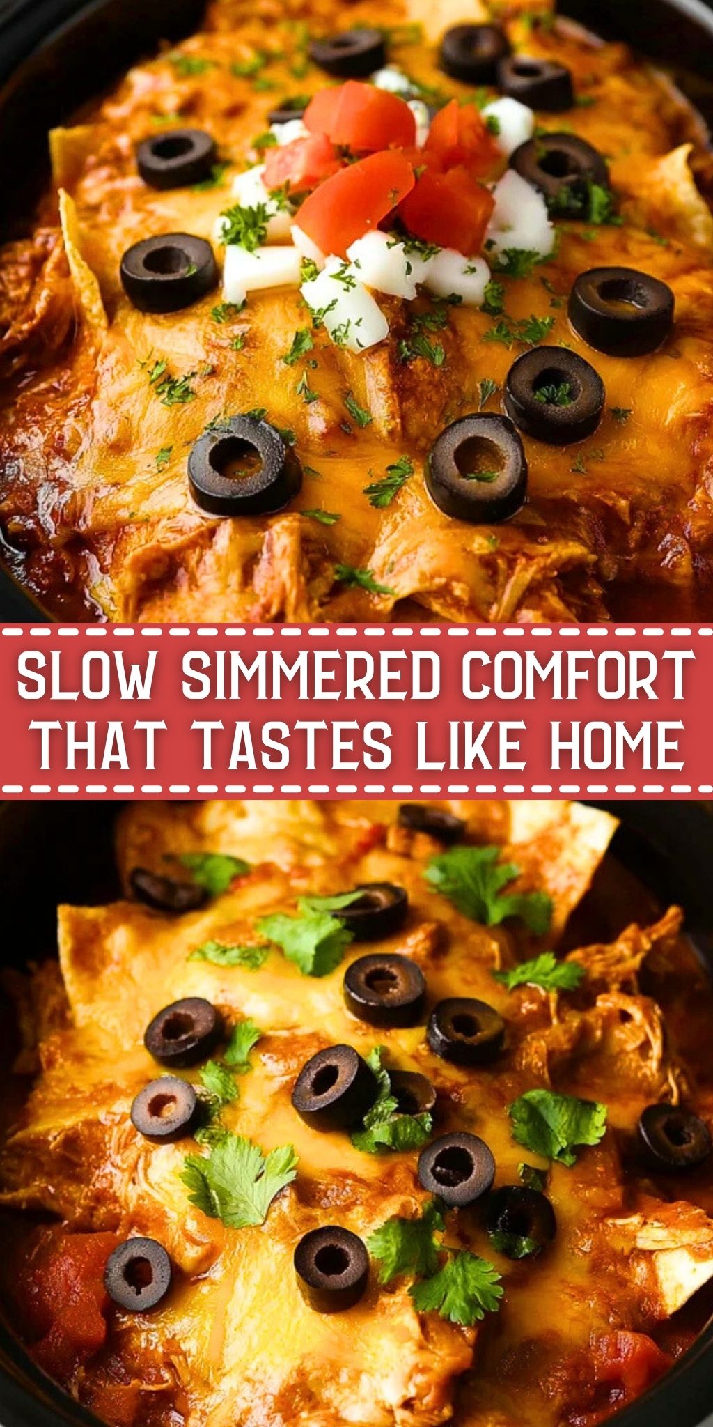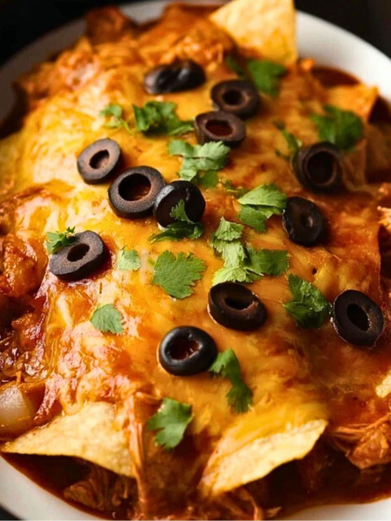 Imagine tender shredded chicken wrapped in soft tortillas, baked in a bold enchilada sauce, and blanketed with bubbling cheese, finished with briny black olives and a fresh cilantro garnish. Every bite melts together with that slow-simmered depth that only comes from low and patient cooking. Whether you’re feeding a crowd or savoring leftovers tomorrow, this dish delivers warmth in every bite.