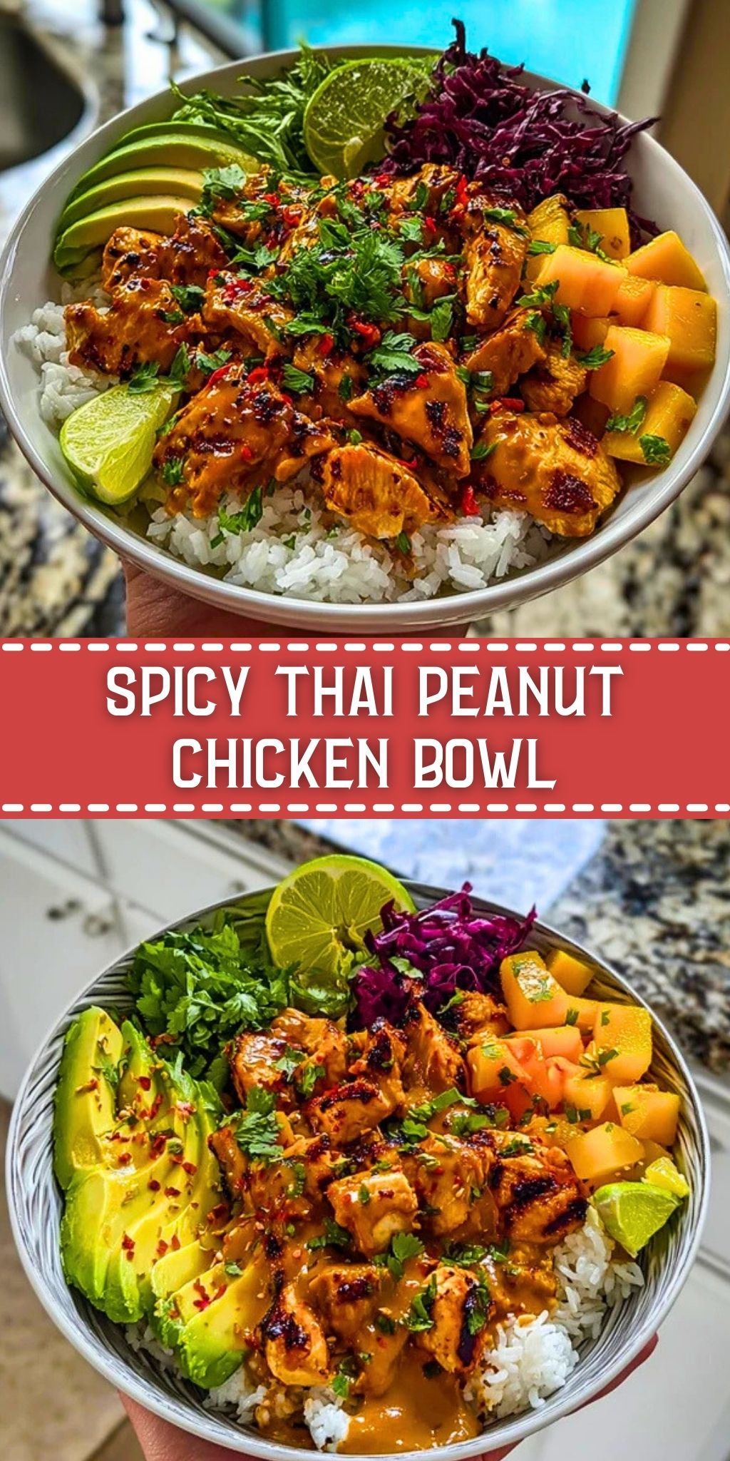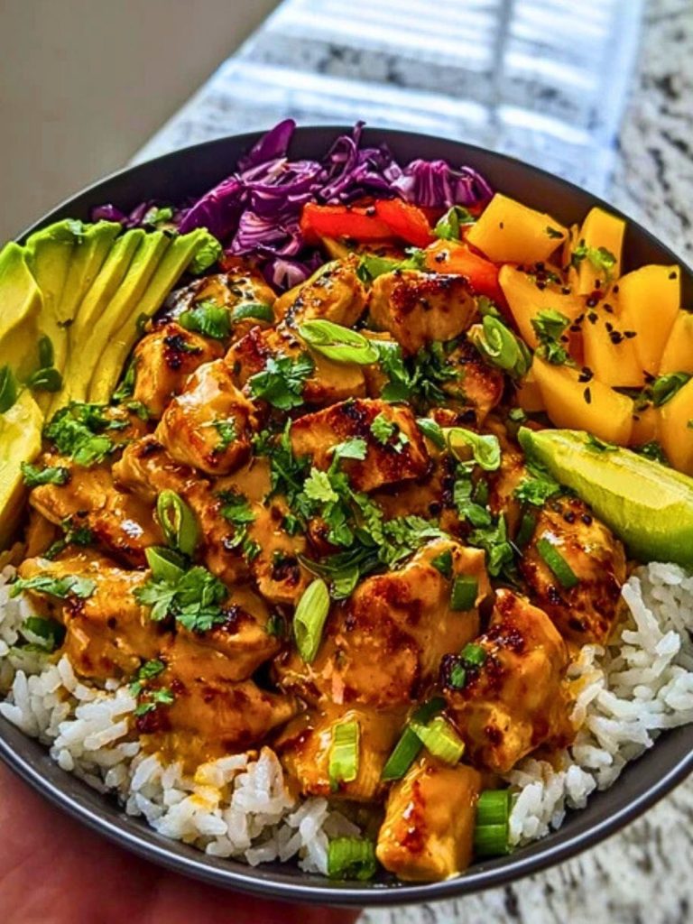 This Spicy Thai Peanut Chicken Bowl combines juicy, marinated chicken with creamy peanut sauce, crisp veggies, fluffy jasmine rice, and tropical mango. It’s a vibrant, balanced meal perfect for meal prep or weeknight dinners.