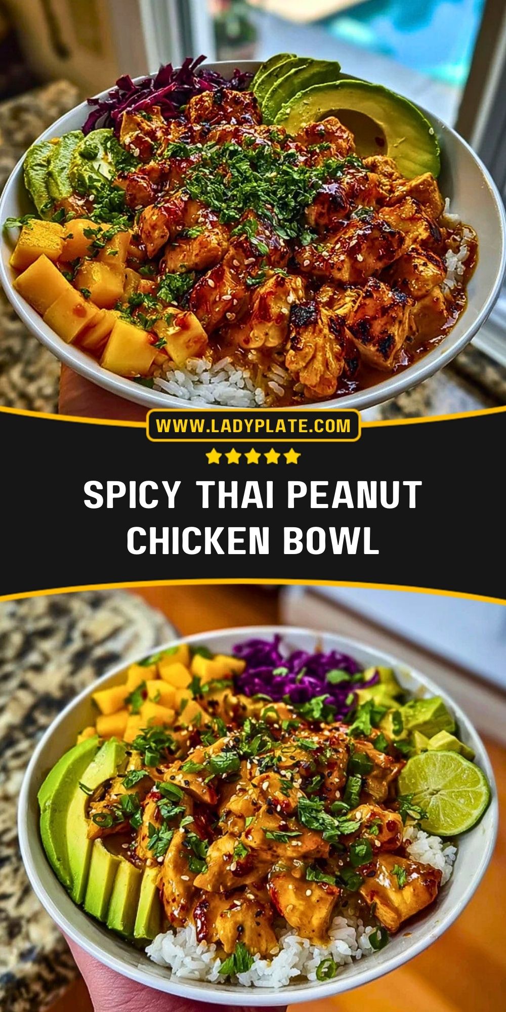 6. Layer rice, chicken, veggies, mango, and avocado in a bowl. Drizzle with peanut sauce.