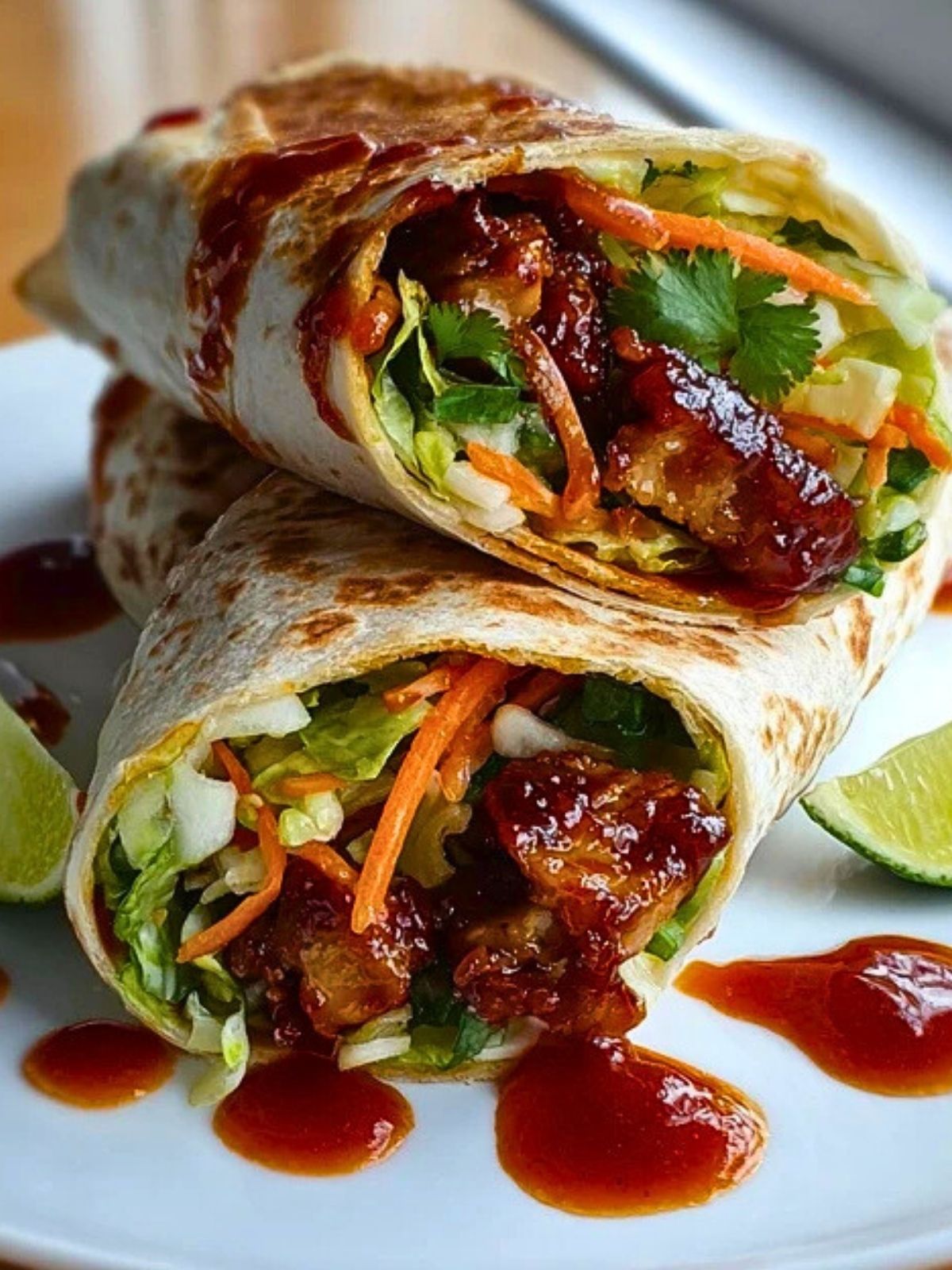 Warm your tortillas briefly to make them more pliable. Layer with lettuce, carrots, cilantro, and the glazed chicken. Drizzle with extra sauce or a squeeze of lime. Wrap tightly like a burrito.