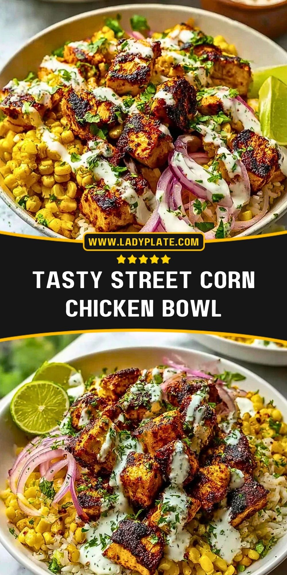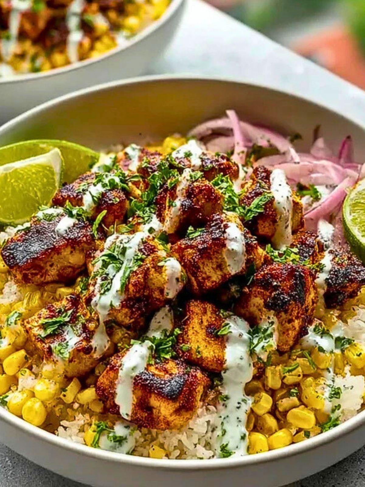 A vibrant, street food-inspired bowl loaded with juicy spice-rubbed chicken, charred sweet corn, tangy lime crema, and fluffy rice. Perfect for meal prep or a satisfying weeknight dinner.