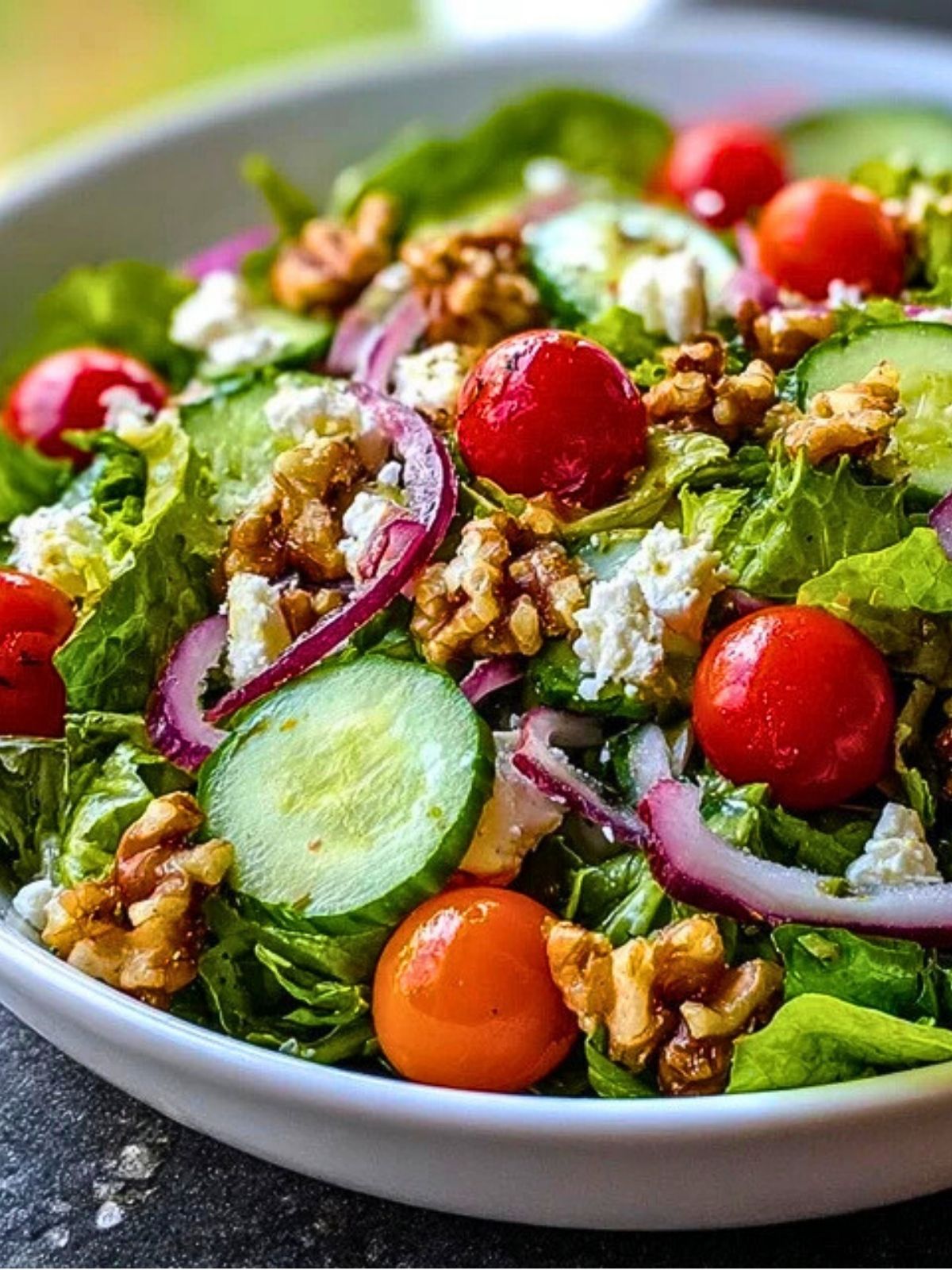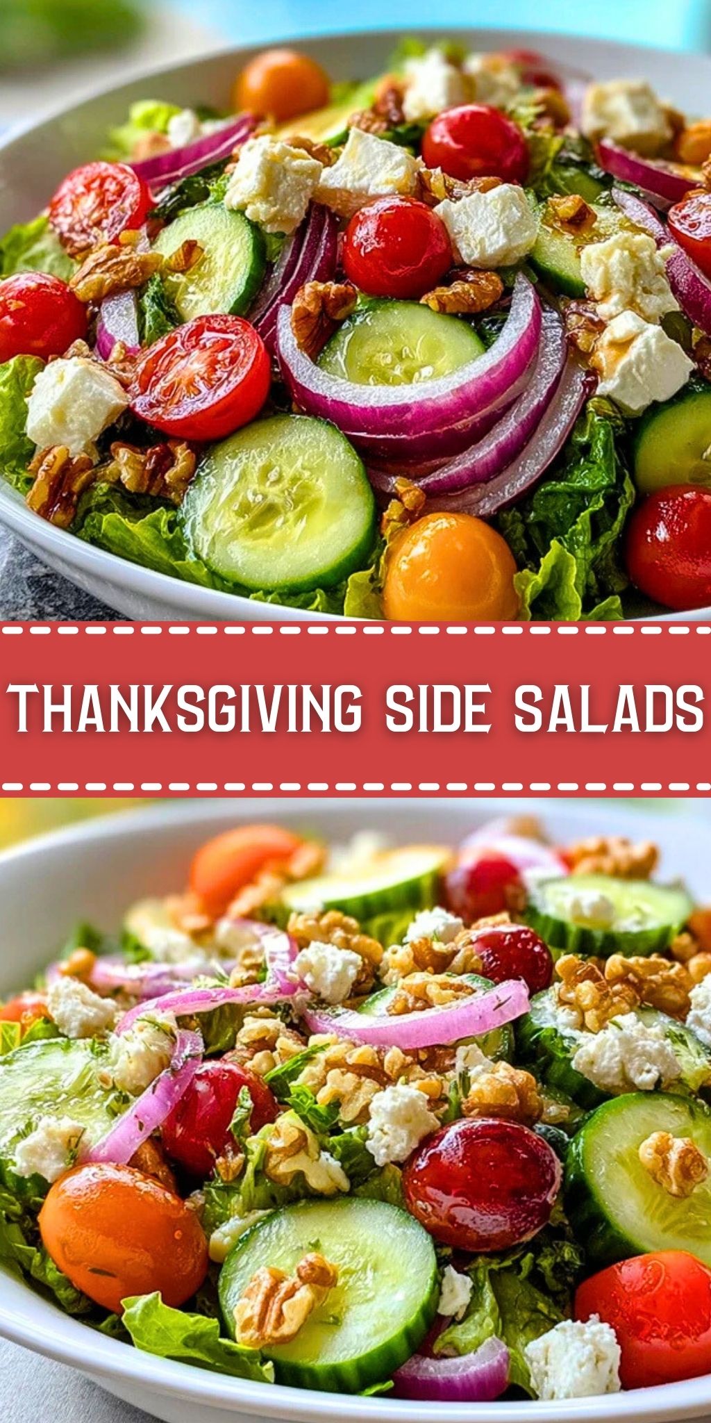 A refreshing and vibrant Thanksgiving Side Salad loaded with crisp romaine, juicy cherry tomatoes, cool cucumbers, tangy feta, and sweet candied walnuts. Balanced with a drizzle of olive oil and balsamic vinegar, it’s the perfect light and colorful dish to complement rich holiday mains.