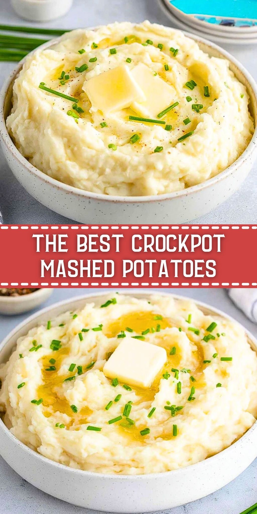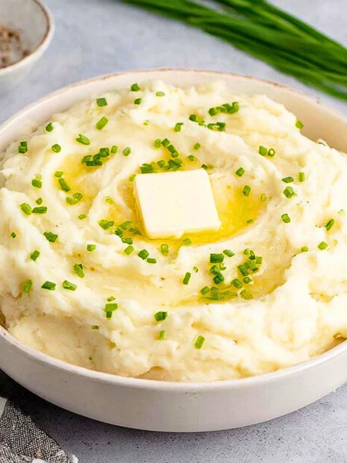 Transfer the mashed potatoes to a serving bowl. Top with a pat of butter and chopped chives, if using. Serve immediately or keep warm in the crockpot on the “warm” setting.