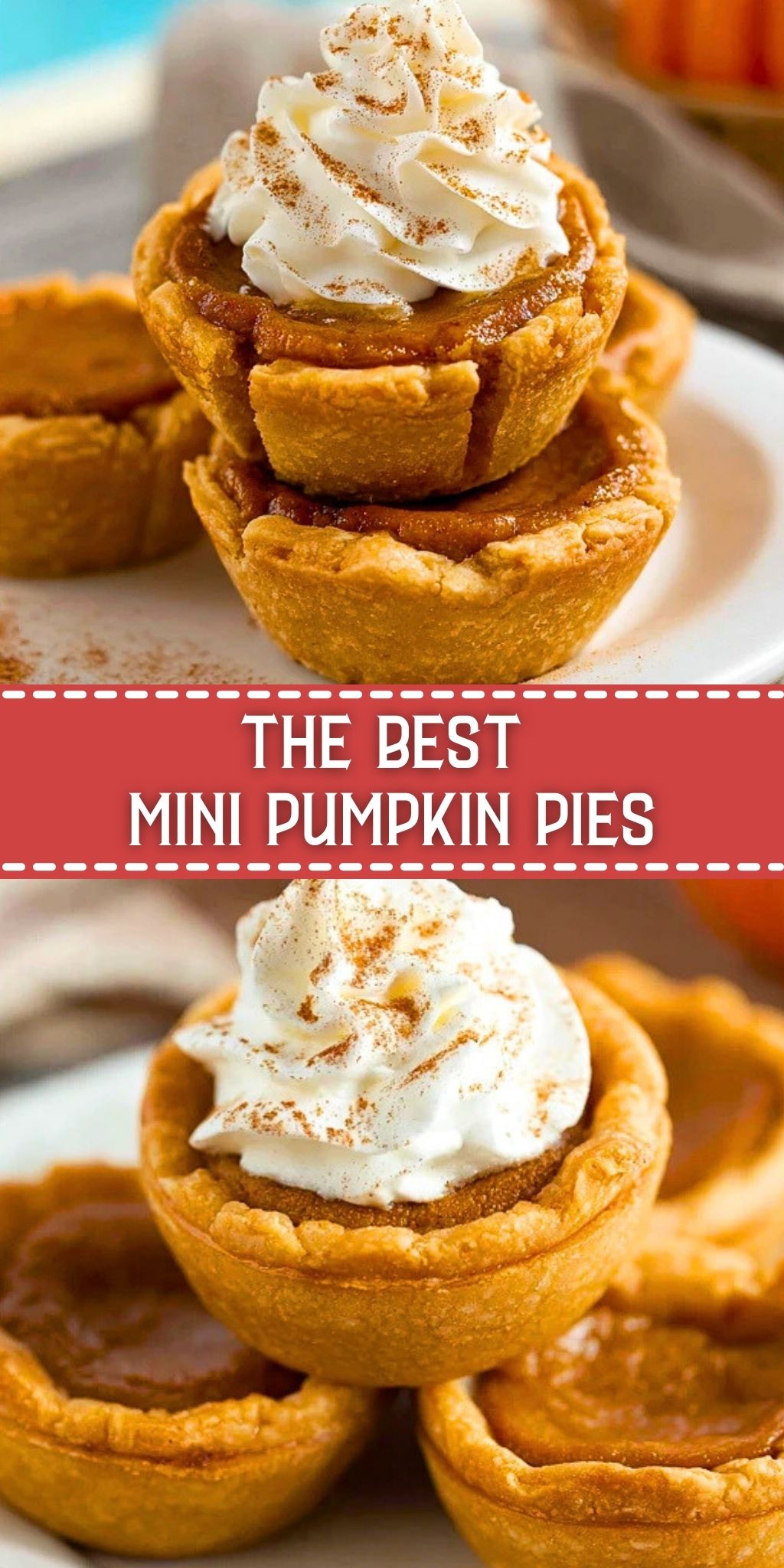 Mini Pumpkin Pies are the perfect bite-sized version of the classic fall dessert. Creamy, spiced pumpkin filling in a flaky golden crust, topped with whipped cream—these mini pies are quick to bake, easy to serve, and ideal for holidays or gatherings.