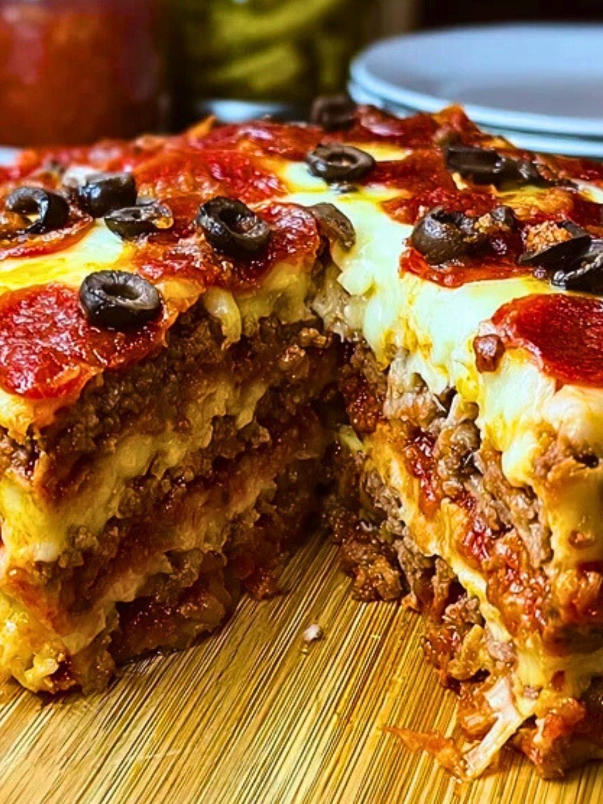 Each layer is stacked with seasoned ground beef, spicy pepperoni, gooey mozzarella, and a bold tomato sauce that binds it all together. Finished with a golden-brown top of bubbly cheese and scattered black olives, this dish is rich, satisfying, and destined to be the star of any table.