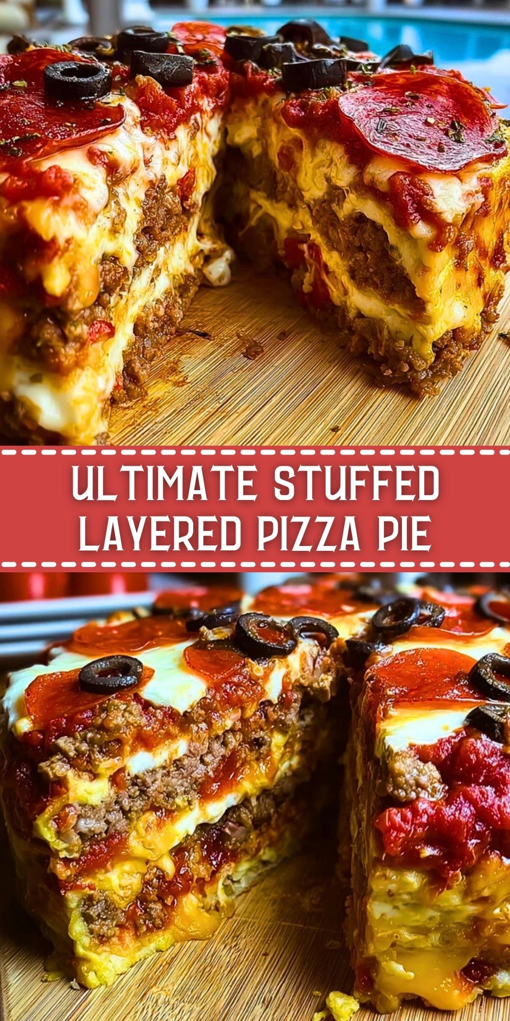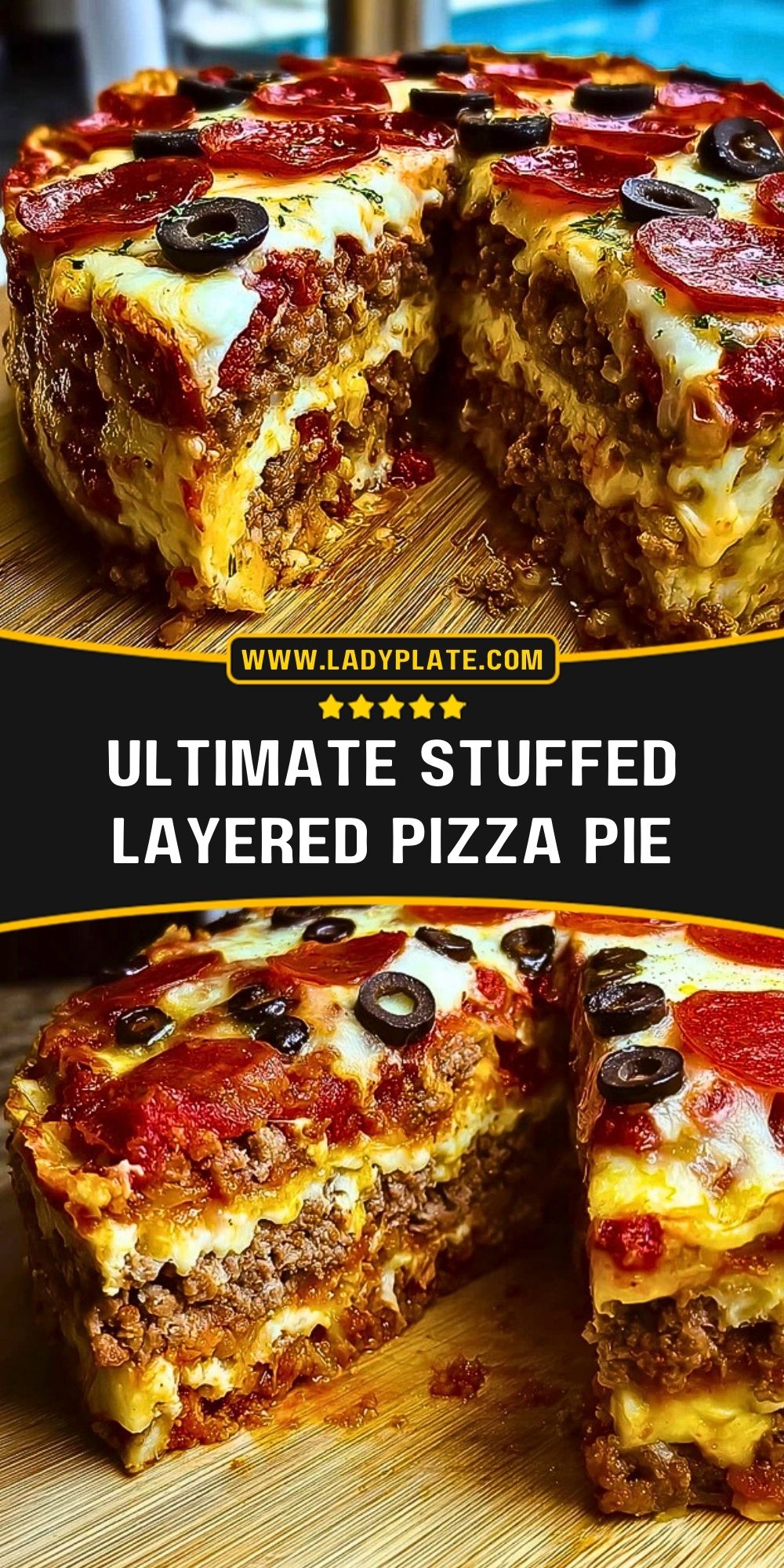 This Ultimate Stuffed Layered Pizza Pie is the perfect mash-up of deep-dish pizza and lasagna. Packed with seasoned ground beef, gooey mozzarella, layers of pasta, and spicy pepperoni, it’s finished with a crispy top of bubbly cheese and black olives. Ideal for hearty family dinners or entertaining guests, it’s a sliceable, savory showstopper.